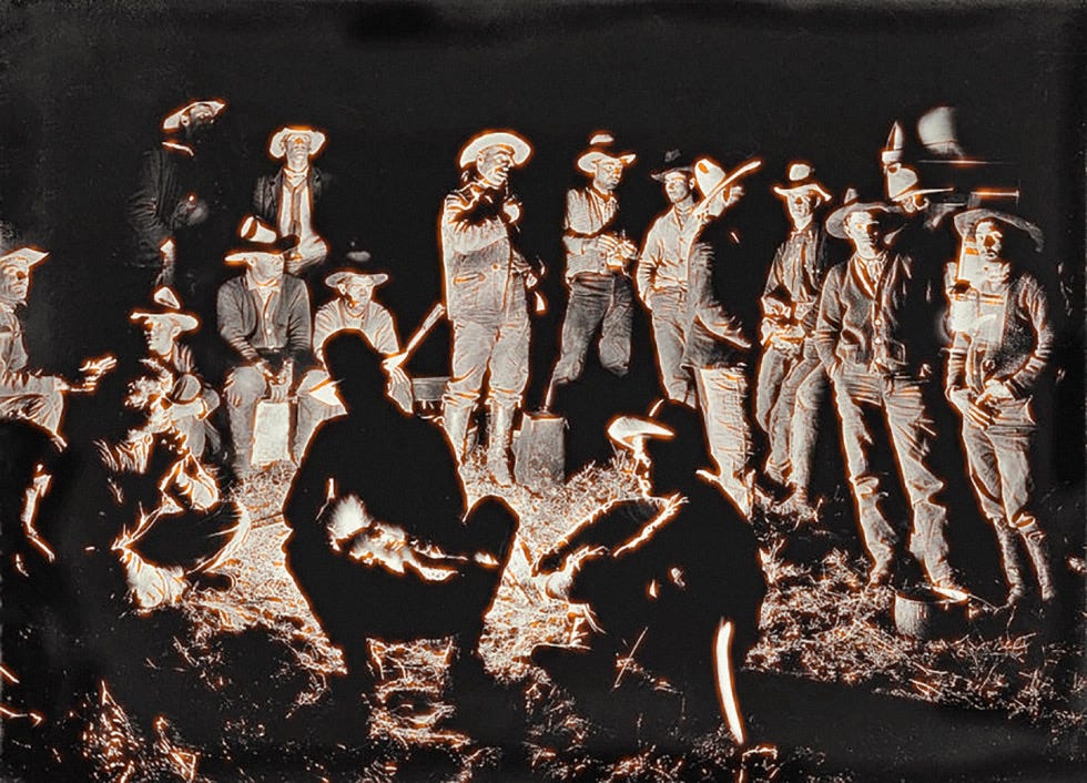 They were standing — speaking only with the discerning sweep of an eye or the ponderous oscillation of a neck — around the interrupted apparatus of a campfire, two nights old. Their moon-carved forms described a coven-circle at this grade of the witching hour, on a territory of ash as soft as heather. Theirs was a covert collective of heads bowed in a reverence that can only be attributed to the serious pleasure of the hunt. Not one man moved, not one man traded a whisper. Soil made supple and softened by smoke wheezed beneath their feet. Firewood collected at the centre of their conspiracy, like daring deeds in darker corners: finally, it was the brooding blond tracker, equipped with the marled grey gaze of a crow beset by cataracts, who finally broke the song of their silent vigil. He shucked his tan cattleman derby with the priestly adroit roll of a wrist, and clutched it at his groin, staking the snakeskin brim snugly on his bison-cameo belt buckle.